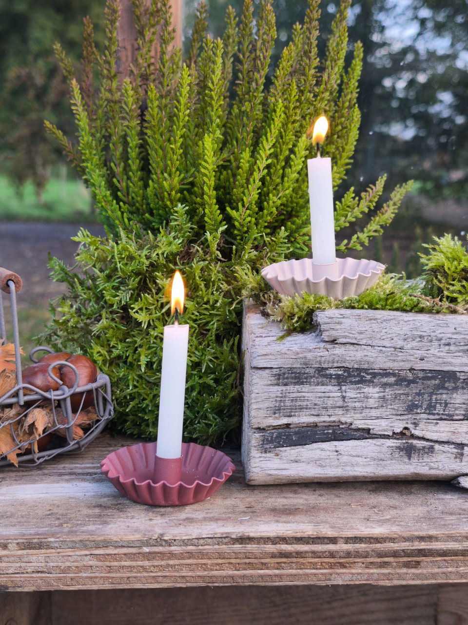 Kerzenhalter für dünne Kerzen (Baumkerzen) zum Hinstellen und Dekorieren für das ganze Jahr - besonders schön natürlich im Herbst und Winter. Set mit zwei Varianten: Sand und Beerenfarben.