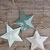 Blechsterne mit Bändchen zum Hinhängen und Dekorieren in drei Farbvarianten in Grüntönen.